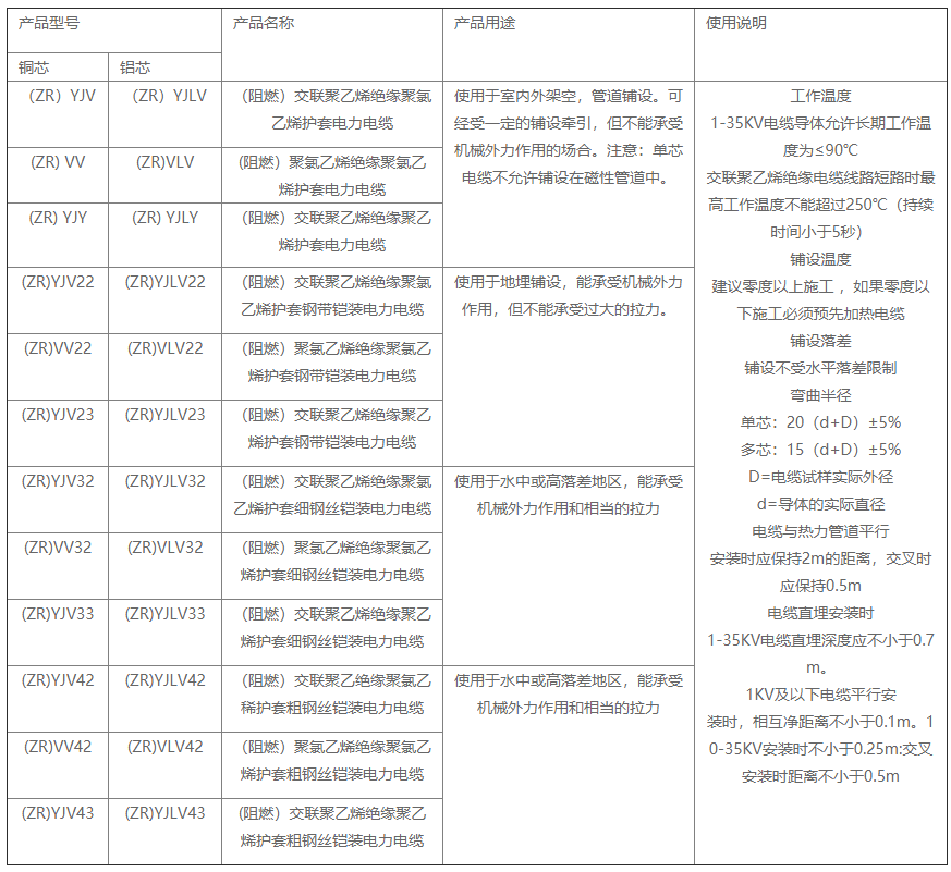 产品型号:YJV、ZR-YJV、WDZ(A、B、C)YJY、WDZN-YJY